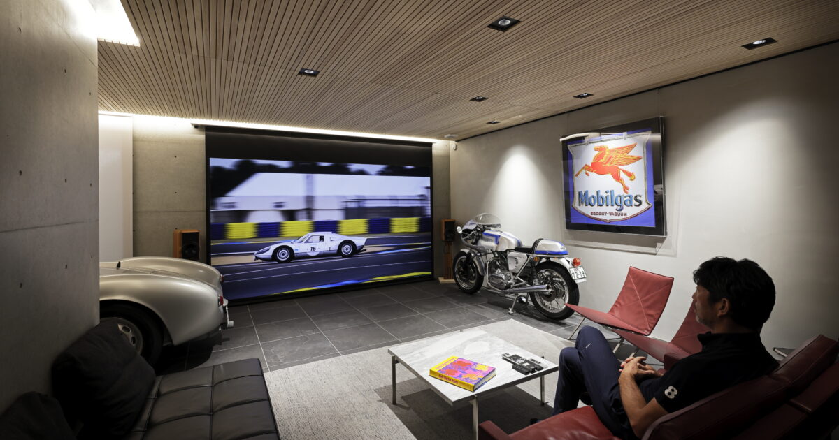 LINN、ポルシェ、ポール・ケアホルム… 機能的で高性能、そして美しいものに囲まれて、多くのご友人達とお楽しみになる150インチシアターです。