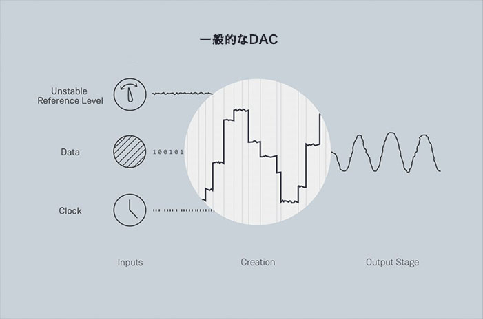 DACデバイスのパフォーマンスを最大化するために必要な項目は多岐に渡ります。最適化されたデータ生成、高精度マスタークロック、独立した専用電源部、そして最高度に安定したリファレンスレベルの供給による圧倒的に低歪みな出力ステージなどです。