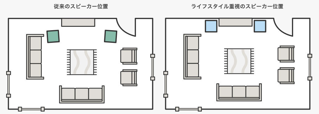 スピーカーの設置においては、壁との距離などによって特に低音域が重なったり打ち消しあったりするため、音響的に良い位置を探しスピーカーを設置する必要がありますが、時にこの場所が生活に不便な場合もしばしば。スペース・オプティマイゼーションは、生活やインテリアにとって相応しい場所にスピーカーを設置しても、優れたサウンドパフォーマンスを得ることを可能にします。